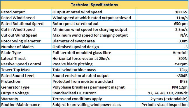 The high performance three blade rotor drives a dual twin axial flux permanent magnet brushless alternator, for better heat management.